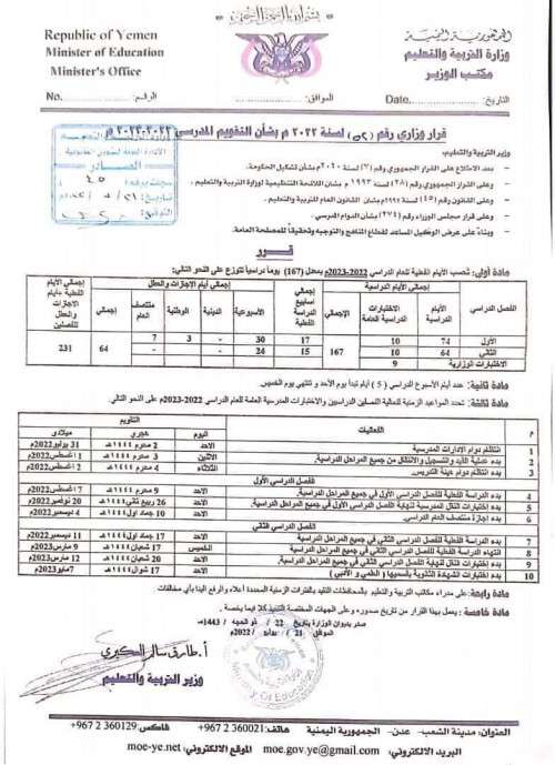 ووفقا للقرار الوزاري رقم 52 لعام2023 بشأن التقويم المدرسي للعام 2022/2023، أن عملية القيد والتسجيل والانتقال في جميع المراحل الدراسية ستبدأ في الأول اغسطس المقبل، وانطلاق الدراسة الفعلية للفصل الدراسي الأول ستكون يوم الأحد 7 اغسطس.