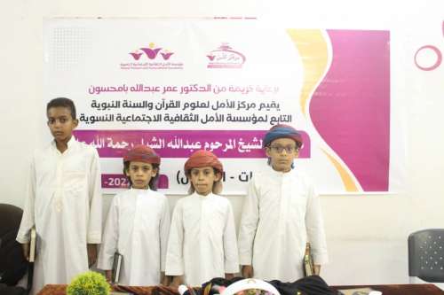 اختتمت بمركز الأمل التابع لمؤسسة الأمل الثقافية الاجتماعية النسوية بالمكلا مسابقة الشيخ عبدالله الشبل السادسة في مجال حفظ القرآن الكريم بمشاركة نحو ( 70 ) مشاركا من النساء والفتيات و الأطفال ، وذلك برعاية كريمة من الدكتور عمر عبدالله بامحسون سفير النوايا الحسنة ، رئيس مجلس أمناء مؤسسة الأمل .