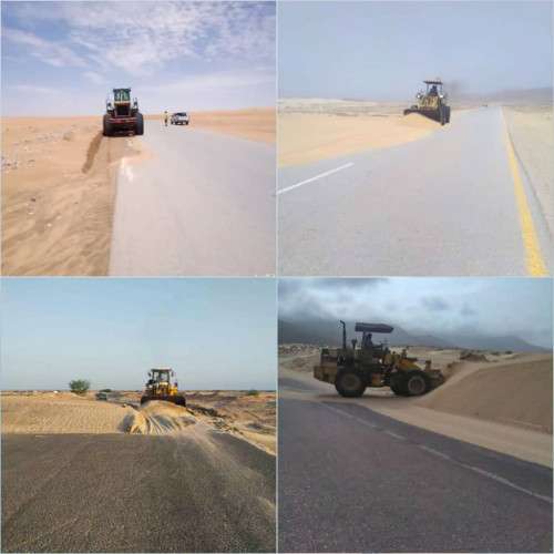 وتقوم المؤسسة العامة للطرق والجسور فرع شبوة كجهة منفذة أعمال ازاحة من عدة طرقات رئيسية وشريانية بالمحافظة تفادياً للحوادث المرورية التي تسببها زحف الرمال للخطوط.