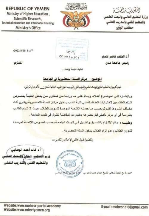 وخاطب وزير التعليم العالي أ.د.خالد أحمد الوصابي، رئيس جامعة عدن، بهذا الشأن موجها بإلغاء السنة التحضيرية المعتمل بها منذ سنوات.