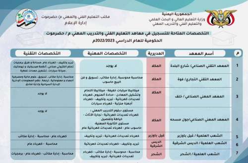ويشمل هذا الصرح كلاً من المعاهد التقنية والفنية بمدينة المكلا والشعب الدراسية بمديرية الشحر والشعب الدراسية بمديرية غيل باوزير ومديرية الديس الشرقية وهذا ما لا يعرفه العديد من أهل المحافظة والطلبة والتي تمتاز بمختلف التخصصات النظرية والعملية لخريجي الصف التاسع والمرحلة الثانوية ، حيث يتميز بمختلف الأجهزة التي تساعدهم في إنجاز الأعمال التي يشملها التخصص في أسرع وقت ممكن ومواكبة سوق العمل.