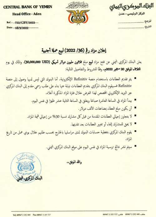 أعلن البنك المركزي اليمني عن فتح مزاد لبيع مبلغ ثلاثون مليون دولار أمريكي (30,000,000 USD)، وذلك في يوم الثلاثاء الموافق 20 سبتمبر 2022م، وفقًا للشروط والتفاصيل التالية: