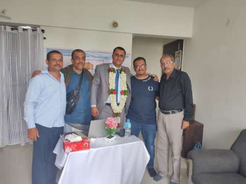 حيث جرت المناقشة أونلاين عبر تطبيق جوجل ميت، وتكونت لجنة المناقشة من البرفيسور راميش تشجلي رئيس قسم اللغة الإنجليزية بجامعة بابا صاحب رئيساً للجنة، والبرفيسور أرفيند ناولي رئيس قسم اللغة الإنجليزي بكلية شيفاجي جامعة أس أر تي أم ناندد ممتحناً خارجياً، والبرفيسور سونيل باوار عميد كلية أس أم دي أم للعلوم الإنسانية والتطبيقية والاقتصاد مشرفاً علمياً، وأشادت لجنة المناقشة بجهود الباحث وطريقة عرضه ومنحته درجة الدكتوراة.