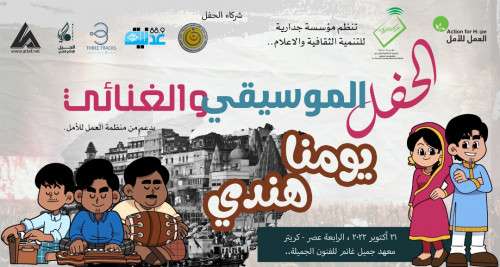 تجري مؤسسة جدارية لتنمية الثقافية والإعلام، بالعاصمة عدن، الترتيبات النهائية لتنظيم حفل موسيقي غنائي تحت عنوان" يومنا هندي"، والمقرر إقامته في 21 من أكتوبر الشهر الجاري، بدعم من منظمة العمل للأمل.