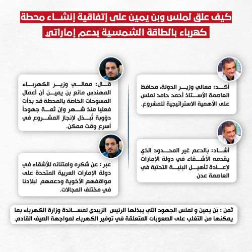 وثمن كلا من بن يمين و لملس بالجهود التي يبذلها الرئيس الزبيدي لمساندة وزارة الكهرباء بما يمكنها من التغلب على الصعوبات المتعلقة في توفير الكهرباء لمواجهة الصيف القادم.
