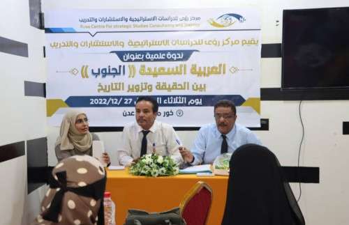 نظم مركز رؤى للدراسات الاستراتيجية والاستشارات والتدريب يوم الثلاثاء ندوة علمية بعنوان العربية السعيدة "الجنوب" بين الحقيقة وتزوير التاريخ في قاعة مركز رؤى في خورمكسر عدن.
