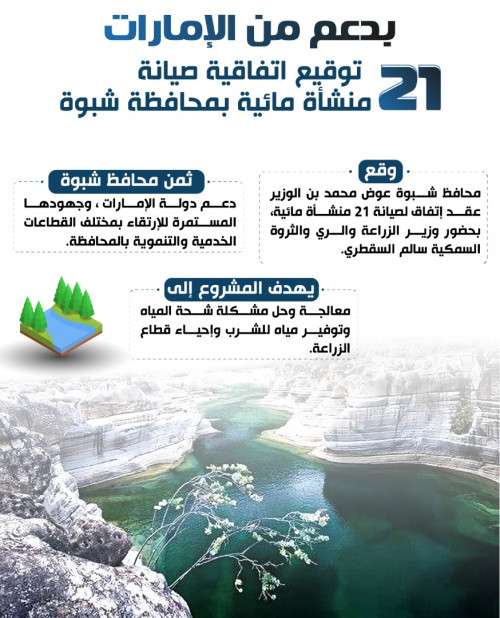ومن جانبه أشاد محافظ شبوة الشيخ عوض ابن الوزير العولقي، عقب توقيعه عقد إتفاق صيانة 21 منشأة مائية بالدعم الإماراتي مشيرا إلى أن المحافظة تحتاج لتنفيذ مثل هذه المشاريع الإستراتيجية التي تلبي إحتياجات المواطنين.