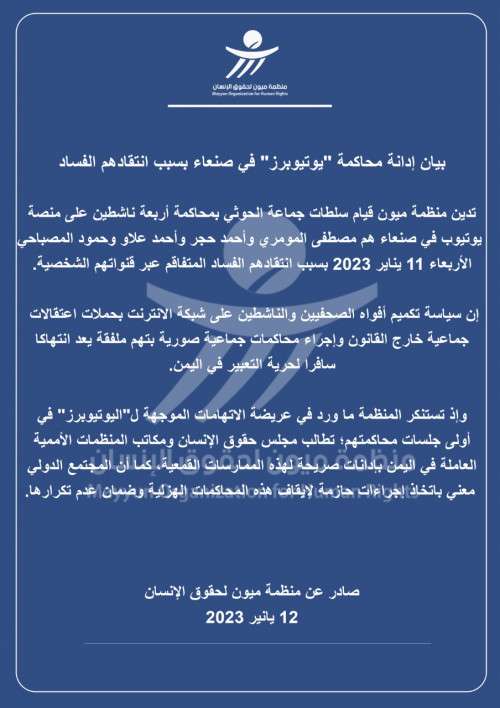 أدانت منظمة ميون لحقوق الإنسان قيام مليشيات الحوثي بمحاكمة أربعة ناشطين على منصة يوتيوب في صنعاء هم مصطفى المومري وأحمد حجر وأحمد علاو وحمود المصباحي بسبب انتقادهم الفساد المتفاقم عبر قنواتهم الشخصية.