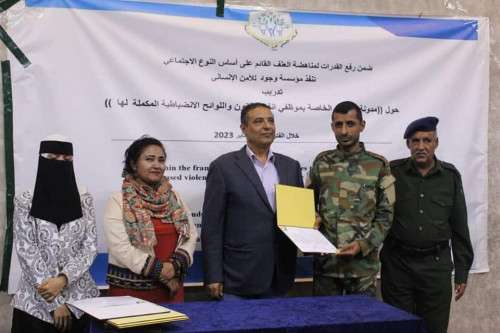 ياتي ذلك ضمن رفع القدرات لمناهضة العنف القائم على النوع الاجتماعي بقيادة المدرب اللواء البروفسور/ علي العولقي وبحضور رئيسة مؤسسة موجود للأمن الانساني / مها عوض ومديرا دارة التدريب والتأهيل في امن محافظة عدن / العقيد مثنى ناصر صالح.