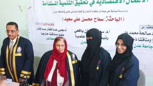 حققت الباحثة سماح محسن علي سعيد الامتياز في المناقشة العلنية لأطروحة الدكتورة الموسومة بدور المسؤولية الاجتماعية كمدخل لمساهمة منظمات الأعمال الاقتصادية في تحقيق التنمية المستدامة دراسة ميدانية على عينة من منظمات الأعمال في القطاع الصناعي الخاص في محافظة عدن وذلك في نيابة شؤون الدراسات العليا بكلية الاقتصاد والعلوم السياسية برنامج الدكتوراه جامعة عدن.