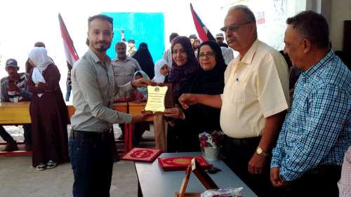 حيث تسلم رئيس المؤسسة سامي العدني درع الشكر المقدم من مدرسة العيدروس للبنات على ما قدمته المؤسسة من دعم ومساهمات لتسهيل إستمرار العملية التعليمية.