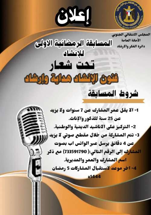 برعاية المجلس الانتقالي الجنوبي تنظم دائرة الفكر والإرشاد في الامانة العامة للمجلس الانتقالي المسابقة الرمضانية الأولى للإنشاد تحت شعار " فنون الإنشاد هداية وإرشاد".