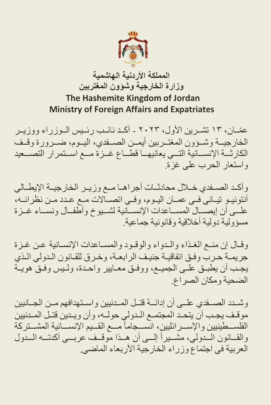 وأكد الصفدي ضرورة إطلاق تحرك دولي فوري ومستمر لوقف التصعيد والحرب على غزة وحماية المدنيين وإيصال المساعدات، والعمل من أجل إعادة إطلاق مفاوضات حقيقية لتحقيق السلام على أساس حل الدولتين لتعيش الدولة الفلسطينية المستقلة ذات السيادة وعاصمتها القدس المحتلة على خطوط الرابع من حزيران ١٩٦٧ بأمن وسلام إلى جانب إسرائيل وفق قرارات الشرعية الدولية ومبادرة السلام العربية.