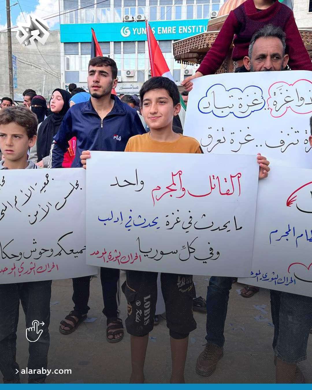 وحمل المتظاهرون الذين شارك معهم العشرات من أطفال المدينة نصرة لإخوانهم أطفال غزة حملوا شعارات تظهر أن مايحدث في غزة يحدث في سوريا .