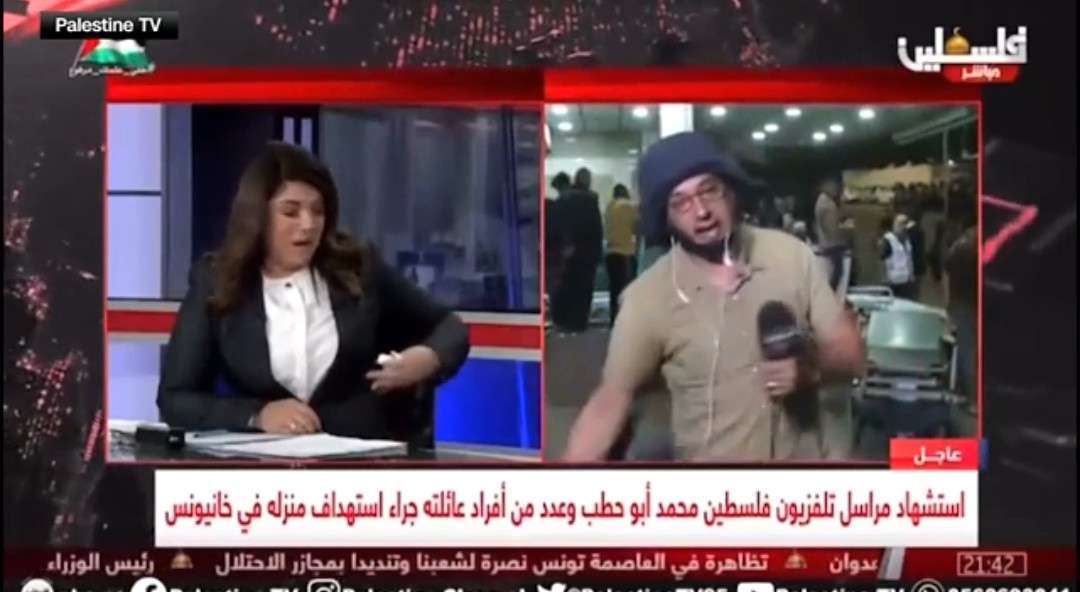 قدم الصحفي في تلفزيون فلسطين، سلمان البشير، تقريرا مؤثرا على الهواء، الخميس، بعد وفاة زميله مراسل تلفزيون فلسطين، محمد أبو حطب، في غزة. وخلع البشير سترته وخوذته وقال: "لا حماية، لا حماية دولية إطلاقاً، لا حصانة من أي شيء، هذه الدروع لا تحمينا ولا تلك القبعات. هذه مجرد شعارات نرتديها، ولا تحمي أي صحفي على الإطلاق. معدات الحماية هذه لا تحمينا". وقُتل مراسل تلفزيون فلسطين و11 من أفراد عائلته، الخميس، في جنوب قطاع غزة بعد غارة جوية إسرائيلية مزعومة على منزله، بحسب بيان صادر عن شبكة التلفزيون التي تديرها السلطة الفلسطينية. وذكرت وكالة الأنباء الفلسطينية (وفا) أن استشهاد محمد أبو حطب وأفراد عائلته جاء نتيجة "غارة جوية إسرائيلية مدمرة" على منزله في خان يونس. وكان أبو حطب يقدم تقريره على الهواء مباشرة مساء الخميس خارج مستشفى ناصر في غزة، وقد كان الأخير له. عاد بعدها إلى منزله وبعد 30 دقيقة من ظهوره على الهواء قُتل في الغارة كما نقلت شبكته. ولم يكن لدى الجيش الإسرائيلي تعليق فوري على الحادث. وقال البشير إن استمرار القصف الإسرائيلي أصبح لا يطاق بالنسبة لشعب غزة، مضيفًا: "نحن نموت واحدا تلو الآخر ولا أحد يهتم بنا أو بالكارثة واسعة النطاق والجريمة في غزة". وكان آخر تقرير لأبو حطب على الهواء يتناول الغارات الجوية الإسرائيلية على أحياء خان يونس وعدد الضحايا، وفقًا لمقطع فيديو بثه التلفزيون الفلسطيني.