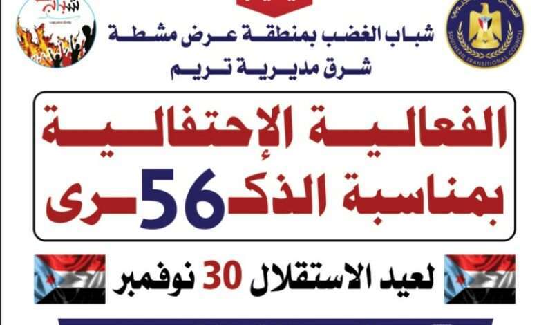 دعا شباب الغضب بوادي و صحراء حضرموت جميع المواطنين إلى المشاركة في الفعالية الاحتفالية بمناسبة الذكرى الـ 56 من 30 نوفمبر عيد الاستقلال الوطني، والتي ستقام في منطقة عرض مشطة شرق مديرية تريم مساء اليوم الخميس الموافق 30 نوفمبر / 2023 م.