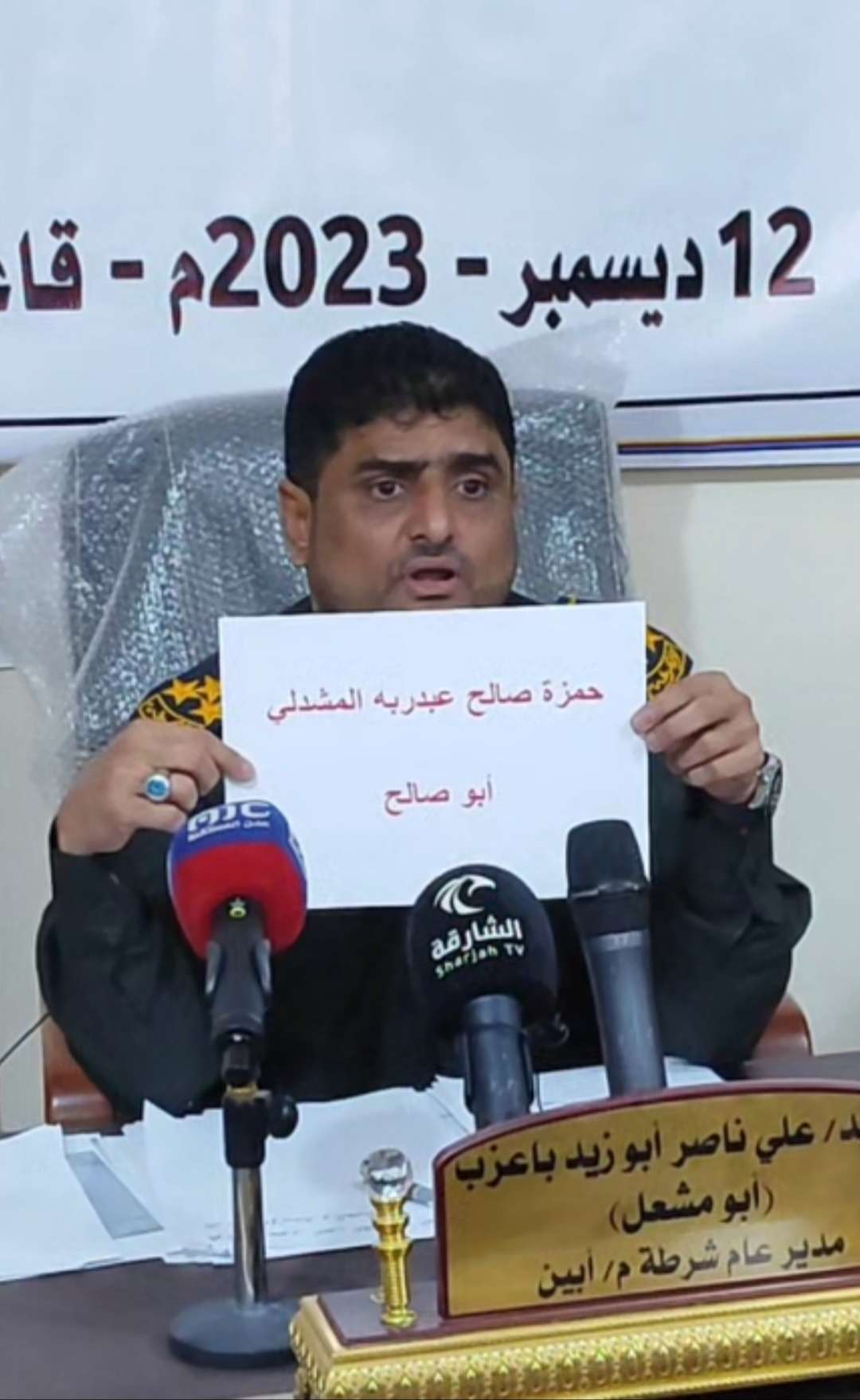 طالب مدير أمن أبين العميد أبو مشعل الكازمي في مؤتمر صحفي هام طالب عضو مجلس الرئاسة سلطان العرادة بتسليم الإرهابي حمزة صالح عبدربه المشدلي أبو صالح زعيم التنظيم الارهابي المدعوم والذي يقف خلف قضايا الإرهاب والقتل والتدمير الذي تعرضت له محافظة أبين .