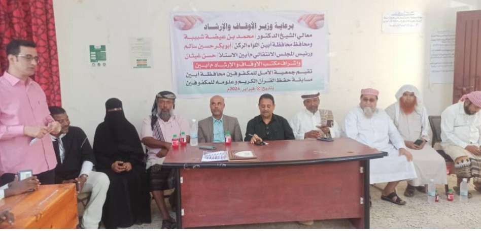 برعاية وزير الأوقاف والإرشاد الشيخ الدكتور محمد بن عيضه شبيبه ومحافظ محافظة ابين اللواء الركن ابوبكر حسين سالم ورئيس الهيئة التنفيذية للمجلس الانتقالي الجنوبي بمحافظة أبين الاستاذ حسن غيثان وبإشراف مباشر من مكتب الأوقاف والإرشاد بالمحافظة أقامت جمعية الأمل للمكفوفين بمحافظة أبين صباح اليوم الخميس مسابقة في حفظ القرآن الكريم وعلومه للمكفوفين لتشجيع حفظة القرآن الكريم من المكفوفين ومساعدتهم في مواصلة مسيرة حفظ القرآن الكريم وتنمية مهاراتهم في حفظ القران وعلومه .