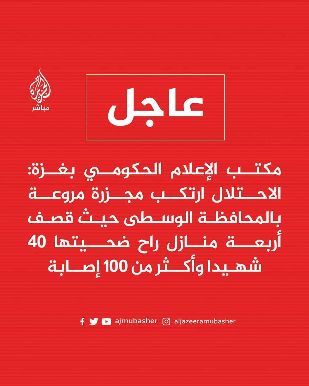 عاجل | مكتب الإعلام الحكومي بـ #غزة: الاحتلال ارتكب مـجـ ــزرة مروعة بالمحافظة الوسطى حيث قــصــف أربعة منازل راح ضحيتها 40 شــهـيــدا وأكثر من 100 إصابة