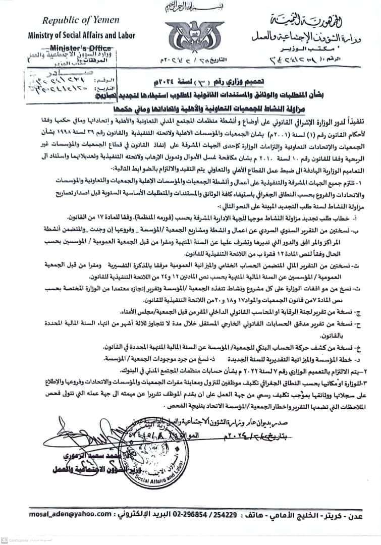 اصدرت وزارة الشؤون الاجتماعية والعمل ، بالعاصمة عدن، تعميماً وزارياً حددت فيه المتطلبات والوثائق والمستندات القانونية المطلوب استيفائها لتجديد تصاريح مزاولة النشاط للجمعيات التعاونية والأهلية واتحاداتها وما في حكمها.