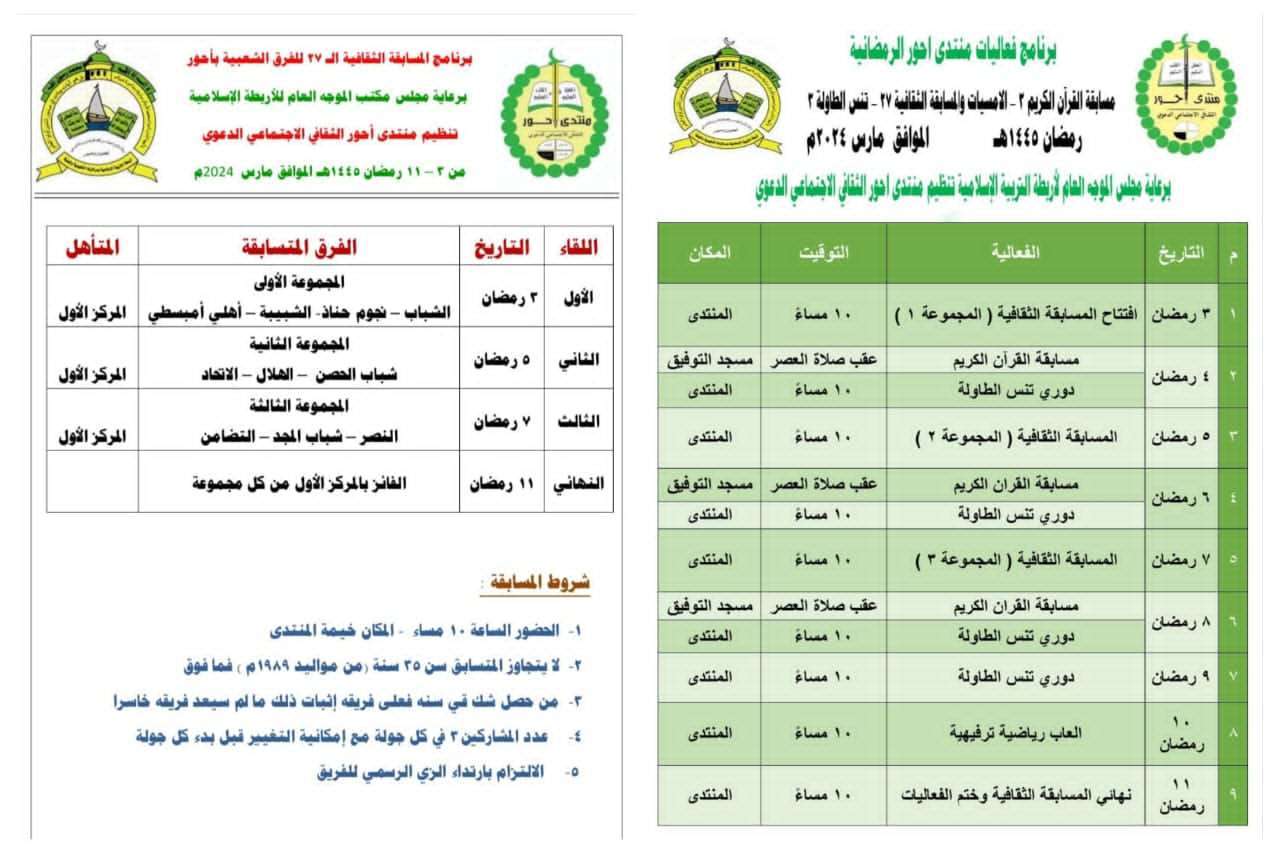 برعاية مجلس مكتب الموجه العام لأربطة التربية الإسلامية ينظم منتدى أحور الثقافي الاجتماعي الدعوي برنامج أنشطته وفعالياته الرمضانية في المجالات الدينية والثقافية والرياضية والترفيهية خلال الفترة من 3 رمضان وحتى 11 رمضان 1445 هـ .