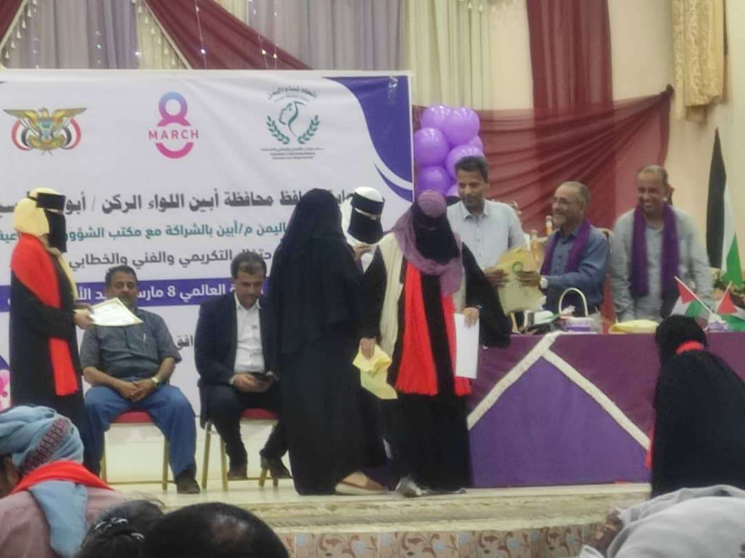 نظم فرع تحاد نساء اليمن بمحافظة أبين بالعاصمة زنجبار صباح اليوم الأحد بقاعة "رهف" للمؤتمرات والأفراح حفلاً خطابياً وفنياً وتكريمياً بمناسبة الـ( 8 ) من مارس يوم المرأة العالمي ويوم الأم الـ(21) مارس وذلك برعاية وحضور محافظ محافظة أبين اللواء الركن/ أبوبكر حسين سالم ومدير عام مكتب الشؤون الاجتماعية والعمل بالمحافظة أ. يحيى اليزيدي.