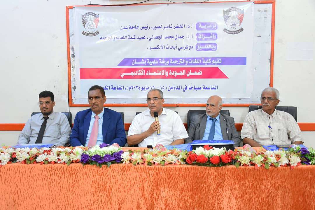 من جانبه، ألقى عميد كلية اللغات والترجمة، الأستاذ الدكتور، جمال محمد الجعدني، كلمة ثمّن من خلالها الجهود الكبيرة التي يبذلها رئيس جامعة عدن، ونوابه، في سبيل ضمان الجودة والاعتماد الأكاديمي بما يُساهم في تحسين العملية التعليمية.