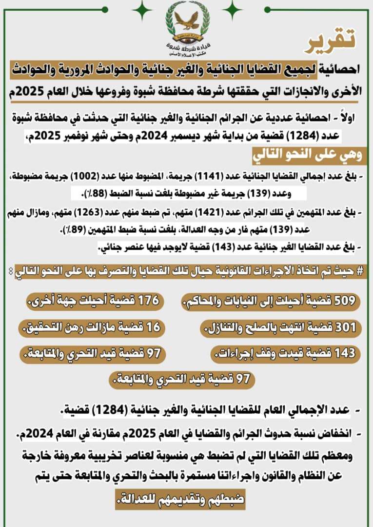 في إطار الجهود الأمنية المتواصلة التي تبذلها شرطة محافظة شبوة، وبالتنسيق مع الأجهزة العسكرية في المحافظة، وبدعم محافظ محافظة شبوة، رئيس اللجنة الأمنية، عوض محمد بن الوزير" وبقيادة مدير عام شرطة المحافظة، العميد الركن فؤاد محمد النسي" مكتب الإعلام الأمني يستعرض تقرير إحصائي شامل يتناول جميع القضايا الجنائية والغير جنائية، بالإضافة إلى الحوادث المرورية التي شهدتها المحافظة، والإنجازات الأمنية التي حققتها شرطة المحافظة وفروعها خلال العام 2025م.