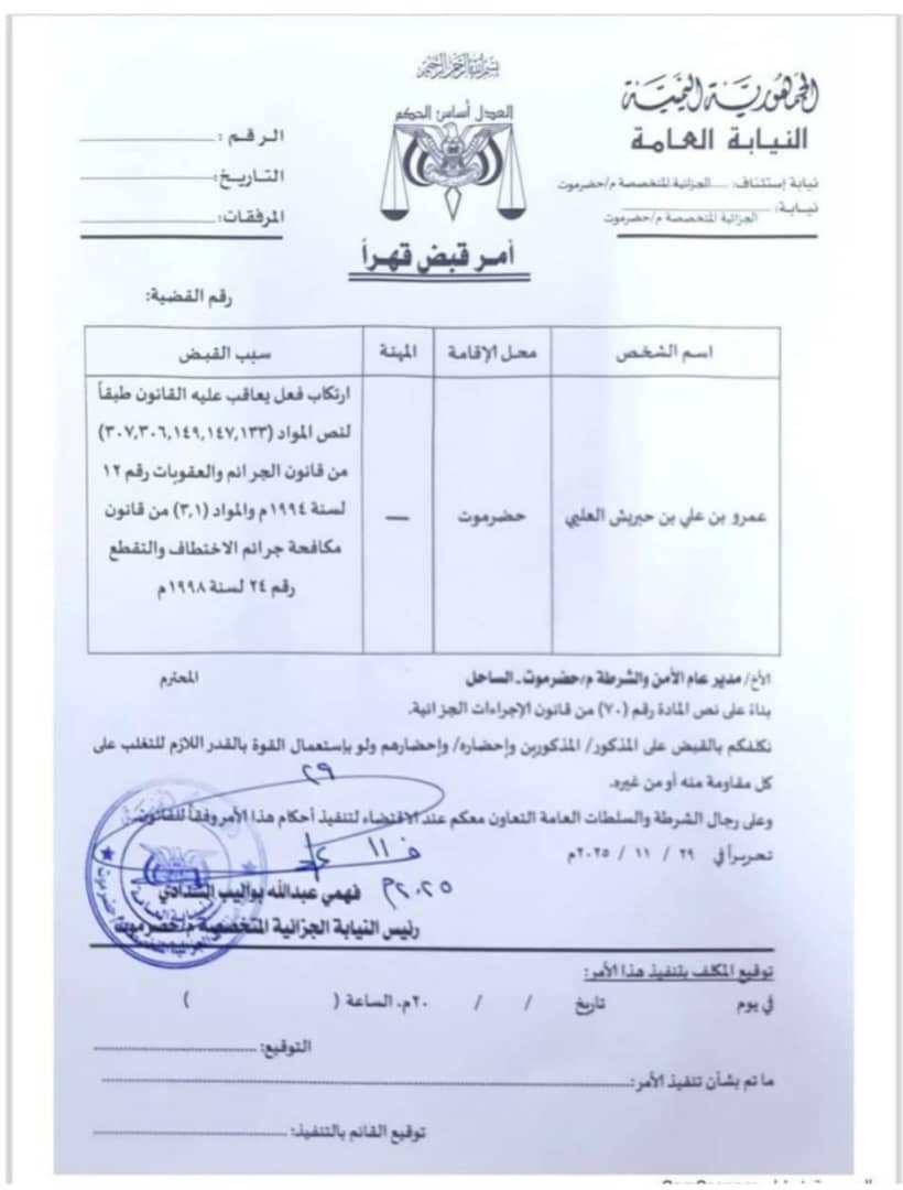 أفاد مصدر بان الإرهابي أويس الريمي، القيادي في تنظيم القاعدة الارهابي لقي مصرعه مساء يوم أمس 2025/12/28م، اثناء مشاركته في القتال ضمن مليشيات المدعو عمرو بن حبريش العليي في المواجهات مع قوات النخبة الحضرمية المسنودة بالقوات المسلحة الجنوبية في وادي خرد ، الشحر ، محافظة حضرموت.