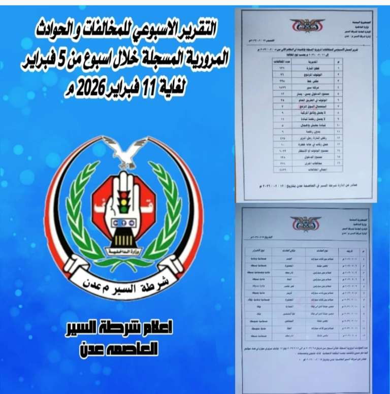 أصدرت إدارة شرطة السير بالعاصمة عدن تقريرها الأسبوعي للفترة من 5/3/2026م حتى 11/3/2026م، موضحةً تسجيل 4439 مخالفة مرورية خلال أسبوع، في إطار جهودها المستمرة لضبط المخالفات وتعزيز السلامة المرورية.