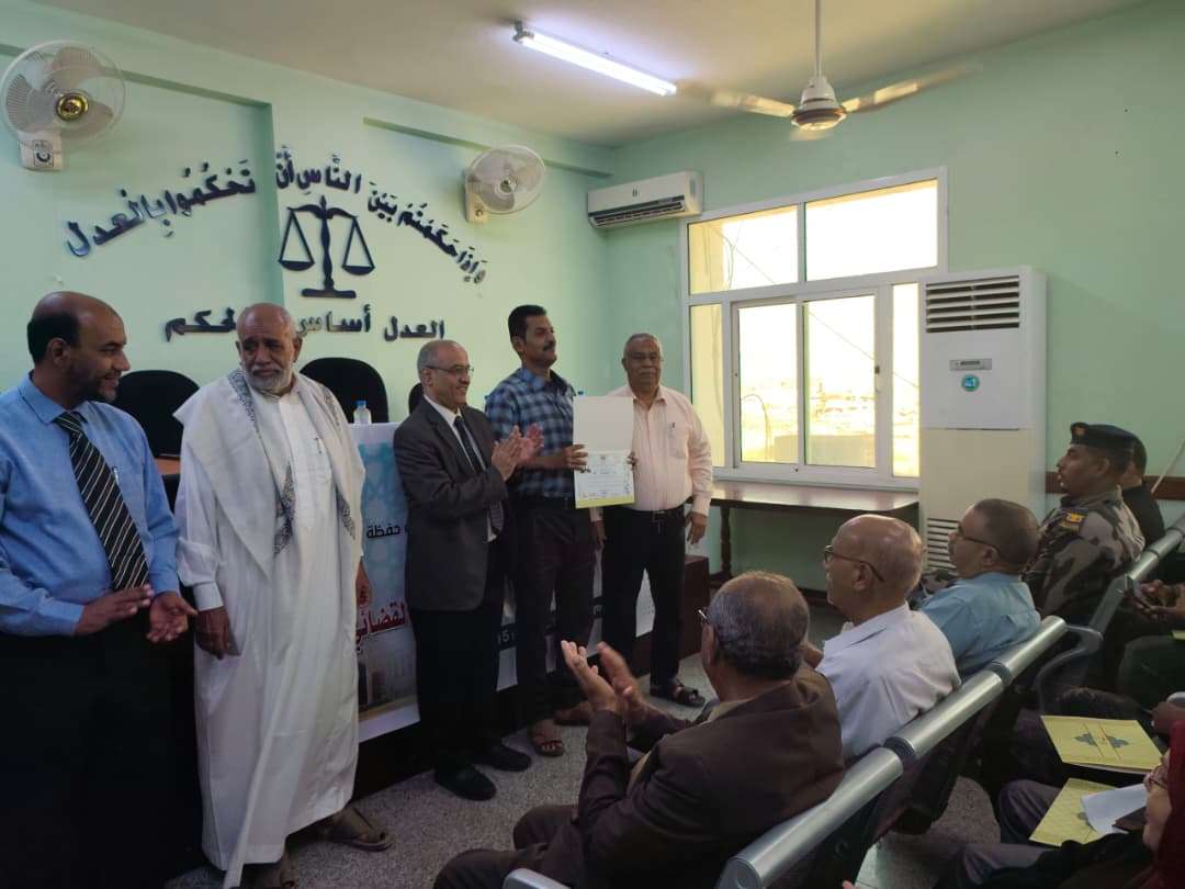 جاء ذلك خلال حفل نظمته محكمة استئناف حضرموت، برعاية معالي وزير العدل القاضي بدر العارضة، تقديرًا للجهود البطولية التي بذلها المكرّمون في الذود عن أحد أهم المرافق الخدمية في المحافظة، والحفاظ على مبانئ ومحتويات المجمّع القضائي في ظروف استثنائية.
