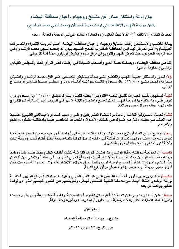 وأوضح البيان أن المواطن الرشدي كان يحمل مبلغًا ماليًا قدره 426,800 ريال سعودي على سبيل الأمانة، قبل أن يتعرض – بحسب البيان – لعملية مصادرة ونهب دون أي محضر ضبط قانوني أو مسوغ شرعي، في واقعة وصفها مشايخ ووجهاء البيضاء بأنها "جريمة مكتملة الأركان".