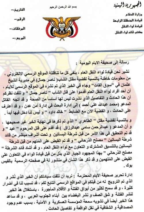و قال أن الشاب المرحوم " ناصر جمال " قد قتل على يد المدعو ( محمد عبدالله علي أحمد ) و قد سلم نفسه إلى إدارة البحث الجنائي في إدارة أمن عدن و القضية أخذت مساره القانوني و القائم على التحقيق فيها الضابط .