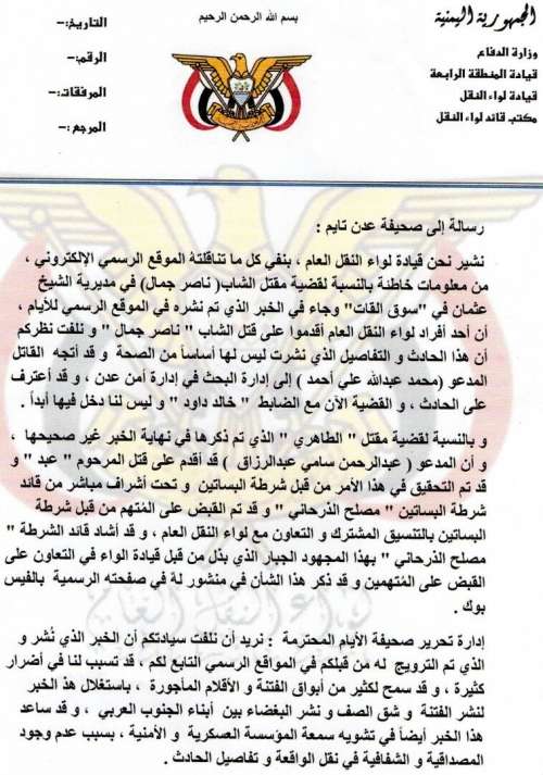 نفى العميد أمجد خالد قائد لواء النقل العام كل المعلومات التي تم نشرها في بعض المواقع الإلكترونية الإخبارية عن مقتل شاب في مديرية الشيخ عثمان على يد أحد أفراد اللواء .