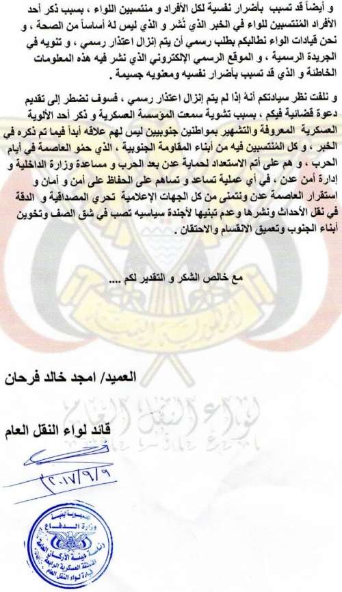 و اختتم حديثة بمطالبة كل الجهات الإعلامية الذي نشرت الخبر بتقديم إعتذار رسمي للواء في الجريدة الرسمية و المواقع الإلكترونية الذي نشر فيه الخبر مالم فنحن نمتلك الحق في تقديم دعوى قضائية بكل هذه الجهات الإعلامية لأنهم ساهموا بتشويه صورة المؤسسة العسكرية و ذكر أحد الألوية العسكرية المعروفة و التشهير بمواطنين جنوبيين ليس لهم علاقة ابدا فيما تم ذكره في الخبر .