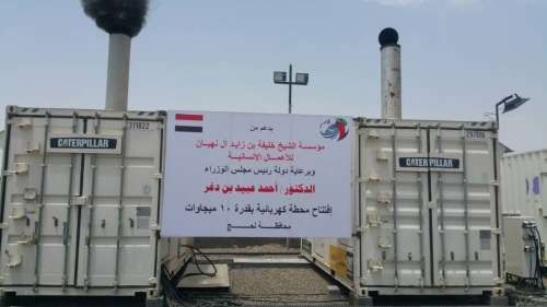 دشن رئيس الوزراء الدكتور أحمد عبيد بن دغر صباح اليوم افتتاح محطة كهرباء محافظة لحج بطاقة 10 ميجاوات والمقدمة من مؤسسة الشيخ خليفة بن زايد آل نهيان.