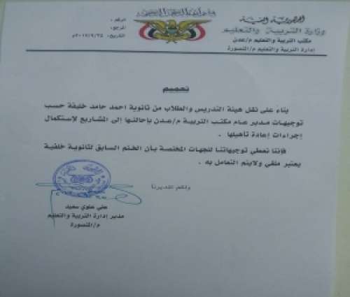 كما تم رفع رسالة من الأخ علي علوي مدير مكتب التربية بمديرية المنصورة إلى الإدارة العامة للتربية والتعليم والتي وافقت على إعادة تأهيل ثانوية خليفة ونقل الطلاب إلى ثانوية النعمان حتى انتهاء التأهيل.