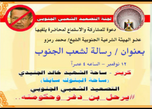 ستقام عصر يومنا هذا الأحد 2017/11/12 م في ساحة الشهيد خالد الجنيدي وضمن فعاليات التصعيد الشعبي الجماهيري لإسقاط حكومة الفساد محاضرة لعضو الهيئة الشرعية الجنوبية الشيخ محمد رمزو.