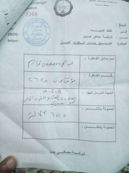 والغريب والعجيب ان الناقلة تحمل تصاريح المرور صادرة من مصفاة عدن التي ليس من حقها إصدار مثل تلك التصاريح.