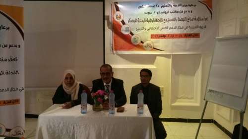 دشن وزير التربية والتعليم الدكتور عبدالله لملس و الدكتورة حفيظة صالح الشيخ الأمين العام للمنظمة الوطنيه للتربية والثقافة والعلوم في العاصمة عدن الدورة التدريبية في مجال « الدعم النفسي الاجتماعي والتربوي » والتي تنفذها منظمة صناع النهضة بالتنسيق مع اللجنة الوطنية اليمنية لليونسكو .