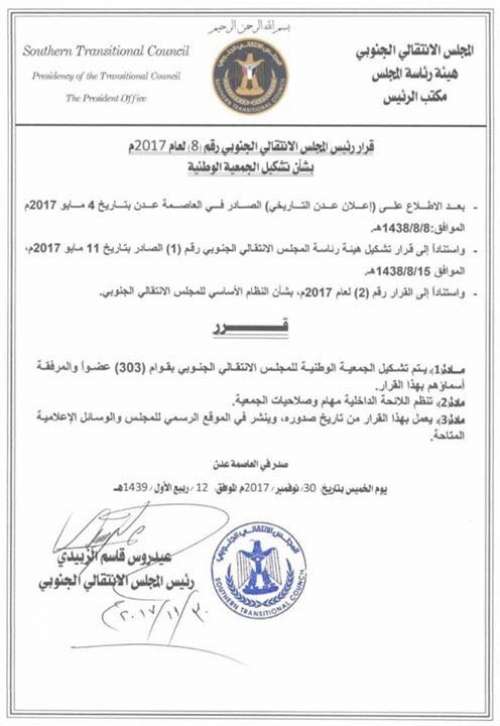أصدر رئيس هيئة رئاسة المجلس الانتقالي الجنوبي الرئيس عيدروس قاسم الزُبيدي، اليوم، القرار رقم (8) لعام 2017م بشأن تشكيل الجمعية الوطنية.