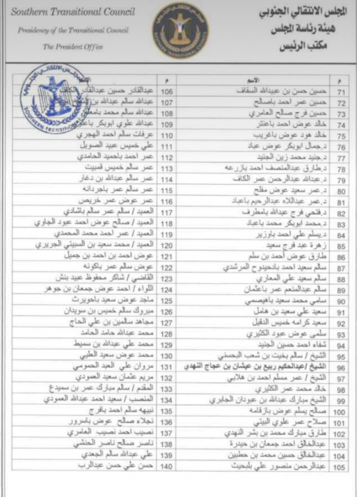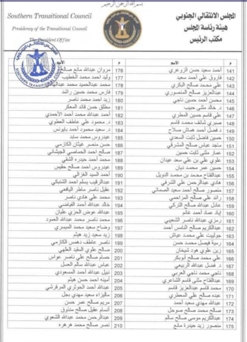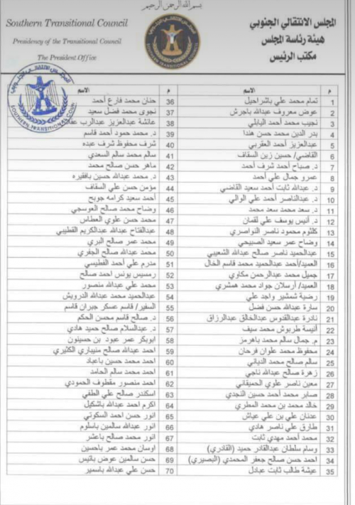 مادة (1): يتم تشكيل الجمعية الوطنية للمجلس الانتقالي الجنوبي بقوام (303) عضواً والمرفقة أسماؤهم بهذا القرار.