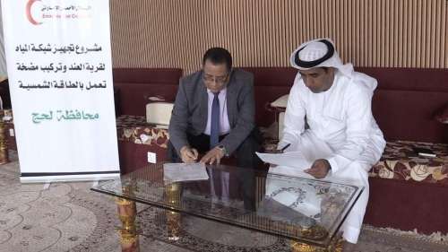 وقعت هيئة الهلال الأحمر الإماراتي صباح اليوم مع محافظ محافظة لحج د. ناصر الخبجي اتفاقية تجهيز شبكة المياه لمنطقة العند وتركيب مضخة تعمل بالطاقة الشمسية.