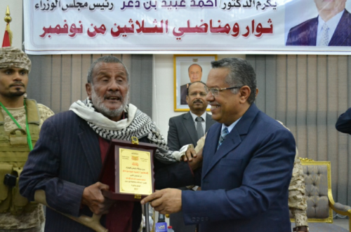 بعد ذلك قام دولة رئيس مجلس الوزراء الد كتور احمدعبيد بن دغر بتوزيع الدروع والشهادات التقديرية لاكثر من (١٥٠) مناضل من مناضلي ال٣٠ من نوفمبر عيد الاستقلال الوطني .
