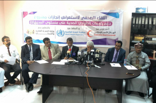 وكرس المؤتمر للحديث عن اتفاق الشراكة بين المنظمة وهيئة الهلال الأحمر الاماراتي، وذلك لتسليط الضوء على الدعم المقدم من الهيئة لدعم مشروع الخدمات الصحية والطوارئ في 9 محافظات يمنية .