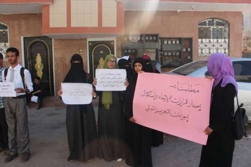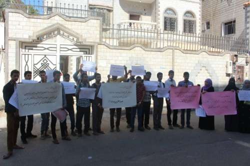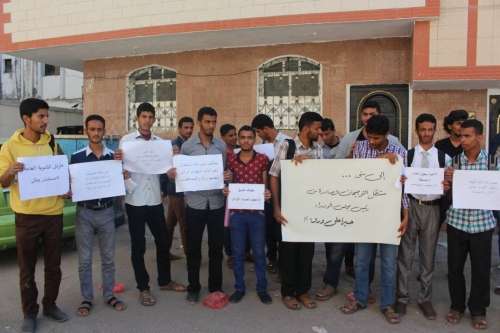 تجمع العشرات من الطلاب الأوائل بالجمهورية و المحافظات للعامين ٢٠١٥ - ٢٠١٦ م أمام مبنى وزارة التعليم العالي بمديرية خور مكسر بعدن صباح اليوم .
