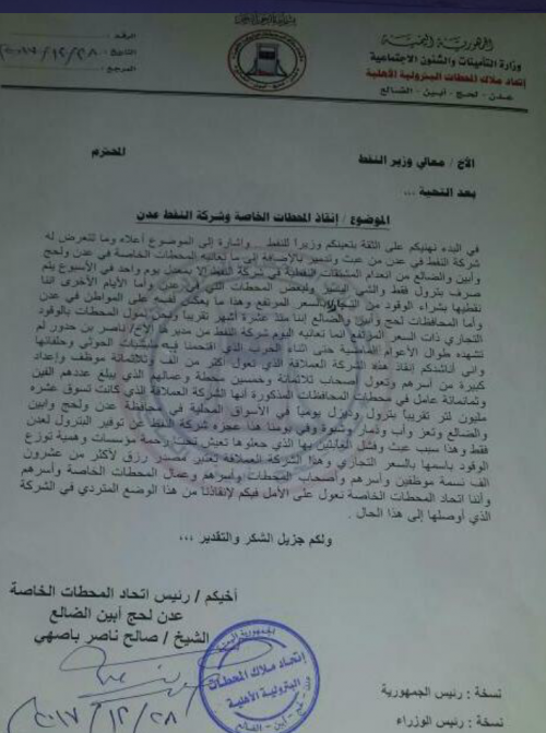 ناشد الشيخ صالح باصهي رئيس اتحادملاك المحطات الأهلية عدن _ لحج _ أبين _ الضالع وزير النفط الاستاذ أوس عبدالله أحمد العود بانقاذ المحطات و شركة النفط عدن من العبث و التدمير و ما تعانية المحطات عدن.لحج .أبين .الضالع من عدم توفر المشتقات النفطية من شركة النفط .