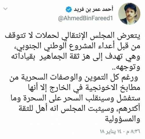 حيث نشر بن فريد في تغريدة له على التويتر : ان الحملات ضد المجلس يقودها و يروج لها أعداء المشروع الوطني الجنوبي و وصفهم بانهم اخوان مسلمين.