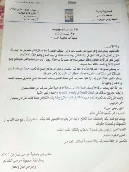 وندعو الحكومة وهذا اخر دعاء ان تراجعوا ضميركم قبل نفقد الصبر ونفقد اعصابنا التي تحترق بسبب الظلم والاهمال والهيانة لدرجة انها وصلت الوقاحة ببعض المسؤولين الى سرقة الاكرامية التي صرفت من الملك سلمان وايضا الجريح الموظف في السلك العسكري يتعرص للسرقة وخصم ونهب راتبه وايضا الرواتب لم تصرف للجرحى ولا الترقيات والعلاج ايضا يتم احتقارنا في المعاملة .
