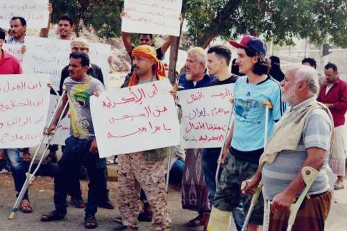 دعت جمعية جرحى عدن في الوقفة الاحتجاجة التي نضمت صباح اليوم الاحد الحكومة الشرعية الى انصافهم وتقديم المساعدة في عالجهم وتسليم رواتبهم .